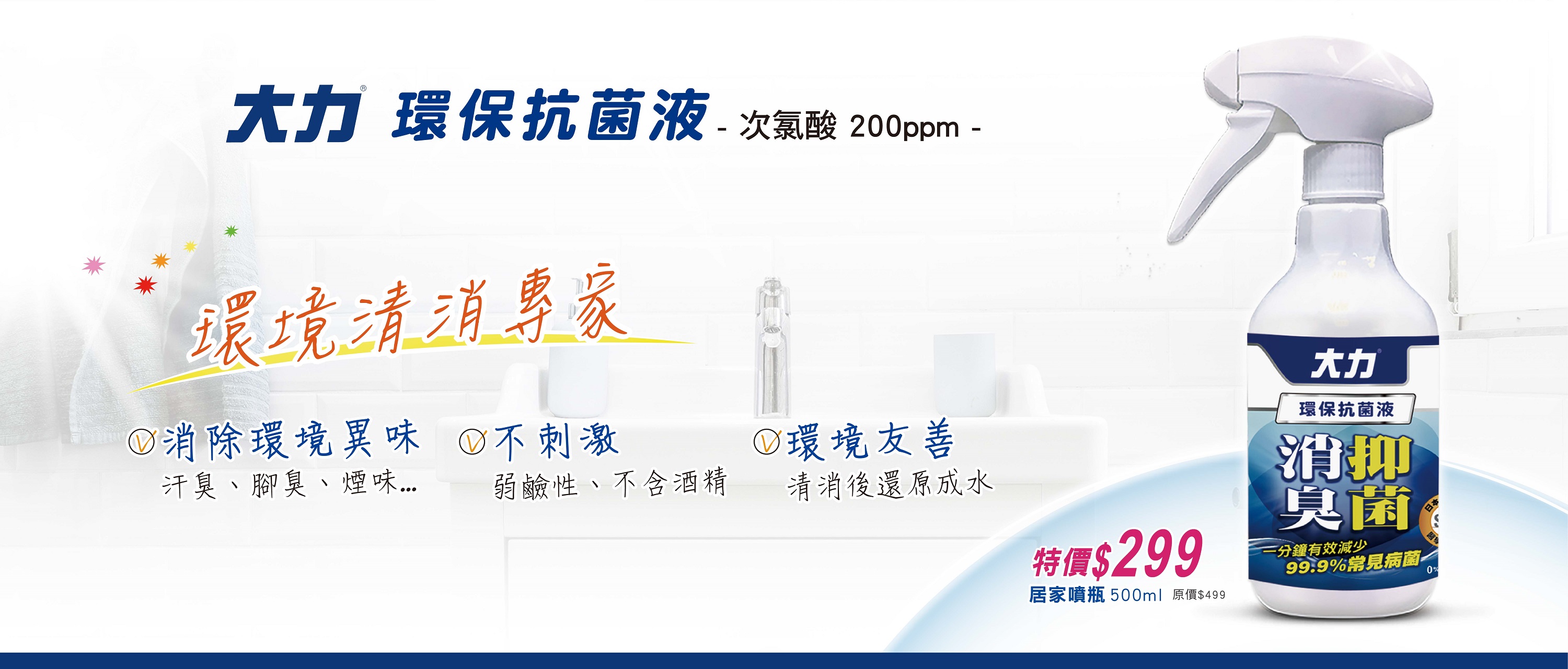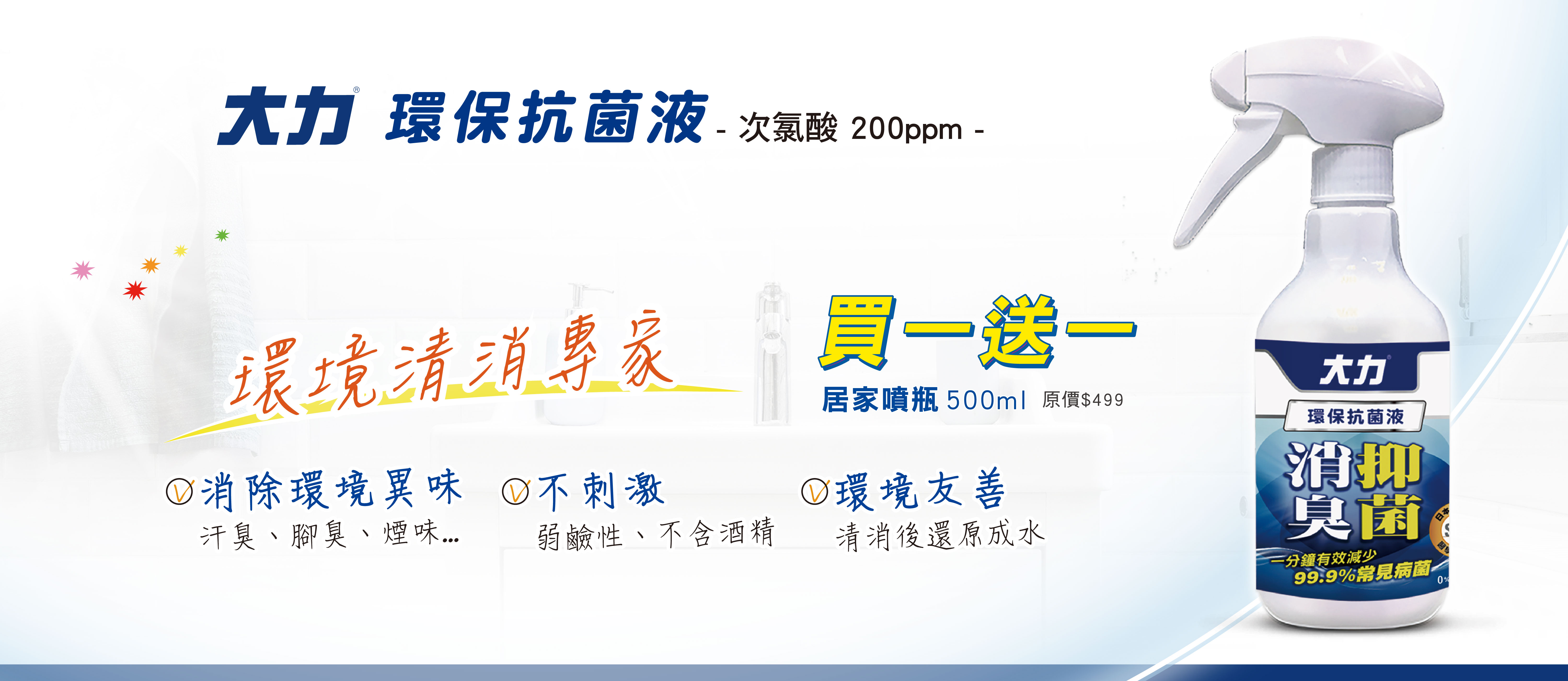 大力環保抗菌液可有效、迅速地去除周遭的病菌,創造安全無虞的衛生環境,為大家的衛生健康把關。